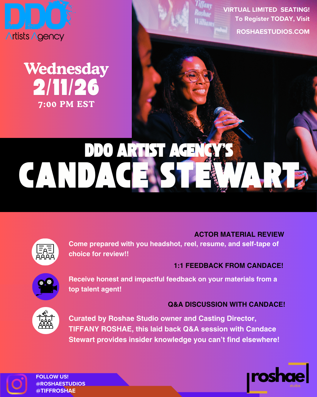 Roshae Studios focuses on actor development and professional readiness. Select tiers offer eligibility for showcases and referrals when appropriate, but representation is never guaranteed.